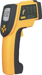 紅外測溫儀測量物體表面溫度,其光學(xué)系統(tǒng)匯聚被測物體的紅外輻射能量,匯聚到的能量聚焦在光電探測器上并轉(zhuǎn)變?yōu)橄鄳?yīng)的電信號,該信號經(jīng)電路轉(zhuǎn)換變?yōu)樽x數(shù)顯示LCD屏幕上,本機配備的激光燈能有效的對準被測物體及提高測量精度。