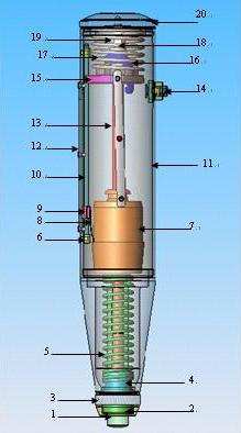 1.彈擊桿 2.卡環(huán) 3.蓋冒 4.彈簧座 5.彈擊拉簧 6.固定塊 7.沖擊錘 8彈簧片 9.指針滑塊 10.指針軸 11.儀殼 12.刻度尺 13.中心導(dǎo)桿 14.按鈕 15.導(dǎo)向法蘭 16.掛鉤 17.壓力彈簧 18.調(diào)整螺栓 19.調(diào)整螺母 20.尾蓋