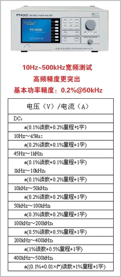 PF4000功率分析儀可解決10Hz~500kHz電信號(hào)的精確測(cè)量,采用DSP高速采樣、低失真寬帶取樣、信號(hào)實(shí)時(shí)分析、PLL鎖相環(huán)同步,線性濾波,過零濾波等國際先進(jìn)技術(shù),保證各種非周期波及高頻信號(hào)的精確測(cè)量,大屏幕液晶顯示所有測(cè)試數(shù)據(jù)與波形,無需電腦即可獨(dú)立工作。10Hz~500kHz寬頻測(cè)試,高頻精度更突出,功率基本精度為0.2%@50kHz。