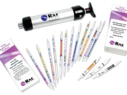 RAE檢測(cè)管,典型的是10支一盒,每個(gè)盒子背面都有試管簡(jiǎn)介。有些試管使用時(shí)需要配有前置管,因而一盒中有5支處理管和5支測(cè)試管,可用于5次測(cè)量。試管上印有測(cè)量刻度,因此必須確保氣體按箭頭方向進(jìn)入試管。試管上還標(biāo)有100ml氣體標(biāo)準(zhǔn)刻度,采樣體積數(shù),測(cè)量單位和氣體型號(hào)。
