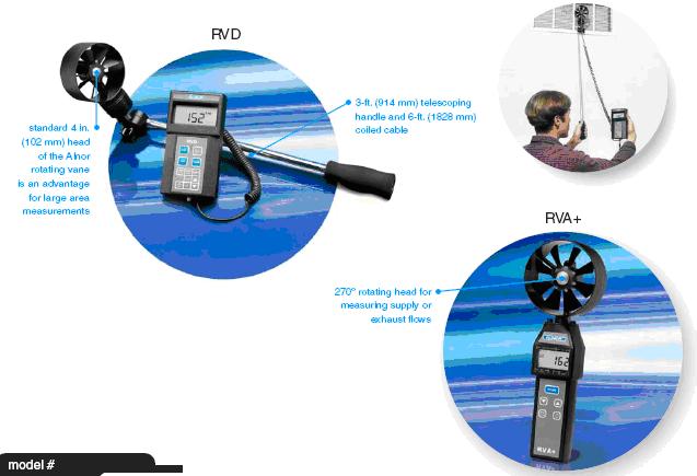 旋轉(zhuǎn)葉片風(fēng)速計(jì)可測(cè)量真實(shí)空氣速度,讀物無需進(jìn)行密度校正因子修正。 RVA+ 的用戶可通過按單側(cè)按鈕并對(duì)被測(cè)量區(qū)域進(jìn)行“掃描”而獲得面積平均流量。 RVD 提供了伸長測(cè)量以及數(shù)據(jù)記錄、調(diào)用和下載功能。
