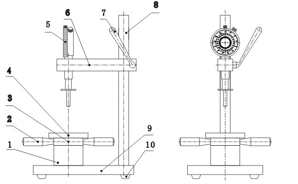 1.測試時,將水果硬度表裝到機(jī)架上,將水果放于工作臺上,旋轉(zhuǎn)機(jī)臺上的手輪柄,使水果硬度表頭壓入水果內(nèi)即可。