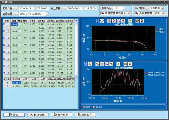 - 測試界面實時顯示I-V曲線,最大功率點24小時區(qū)間內的P-T曲線;查詢界面可顯示任意區(qū)間段內的P-T曲線,不受時間限制。