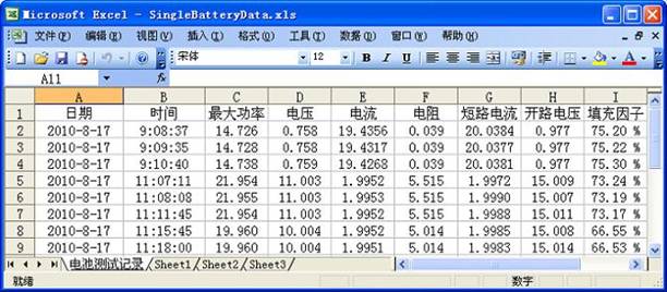 - 可自動測量出:最大輸出功率Pmax;最大功率時的電流值Ipmax,電壓值Vpmax,電阻值Rpmax;短路電流Ishort;開路電壓Vopen;填充因子FF;電池的串聯(lián)電阻Rs以及并聯(lián)電阻Rsh。