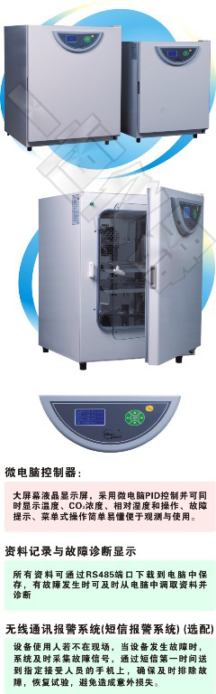 大屏幕液晶顯示屏,采用微電腦PID控制并可同時(shí)顯示溫度、CO2濃度、相對(duì)濕度和操作、故障提示、菜單式操作簡(jiǎn)單易懂便于觀測(cè)與使用。