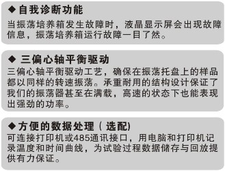 ●獨特控制轉(zhuǎn)速電路,能確保搖床平穩(wěn)啟動,并能防止液體濺出而造成儀器損壞。