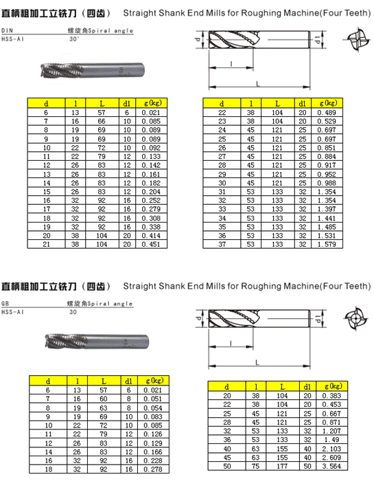- 儀器名稱:直柄粗加工立銑刀(四齒)