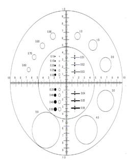 - 關鍵參數:技術指標: 1、放大倍數:10倍。 2、物方視場(能夠看到的面積范圍):30mm 。 3、物方工作距離(下面鏡片與被看物的距離):20mm 。 4、系統(tǒng)長度:50mm 。 5、體積尺寸: 50×48mm 。 6、眼瞳距離(上面鏡片與眼睛的距離):10mm。 7.讀數測量范圍:0~20mm。 8.圓弧測量范圍:0.10~10mm 9.線條測量范圍:0.01~0.08mm 10.測量分劃值:0.1mm